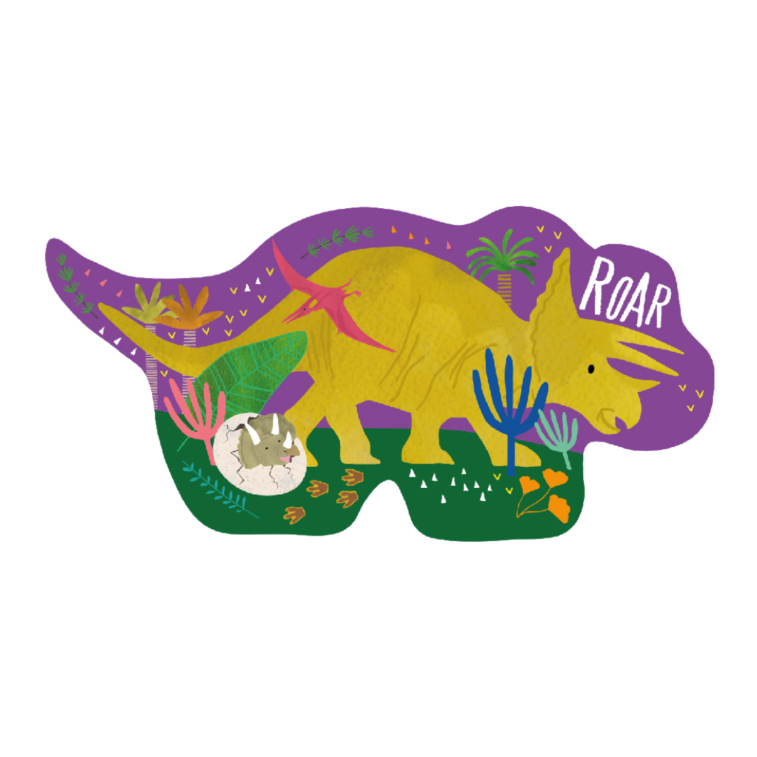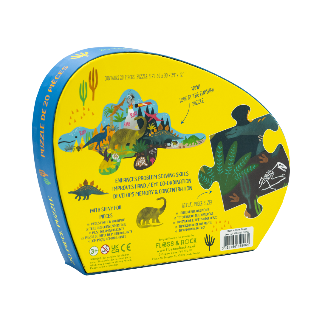 Build a stomping stegosaurus shaped puzzle full of other dino friends including a pterodactyl,  diplodocus, triceratops and more! The shaped reusable box contains 20 chunky puzzle pieces complete with shiny foil details. This fun 20 piece jigsaw enhances problem solving skills, improves hand/eye coordination and develops memory and concentration.