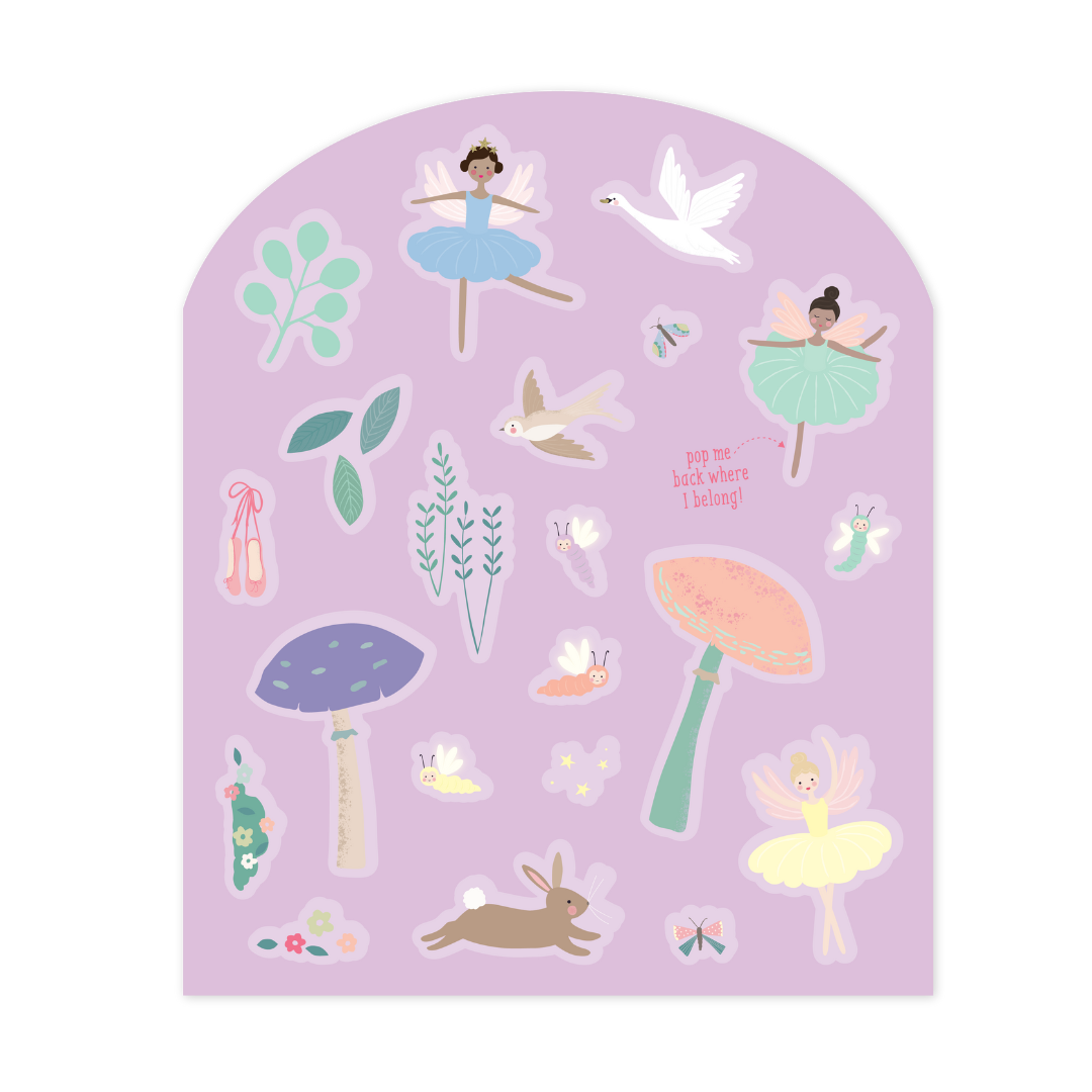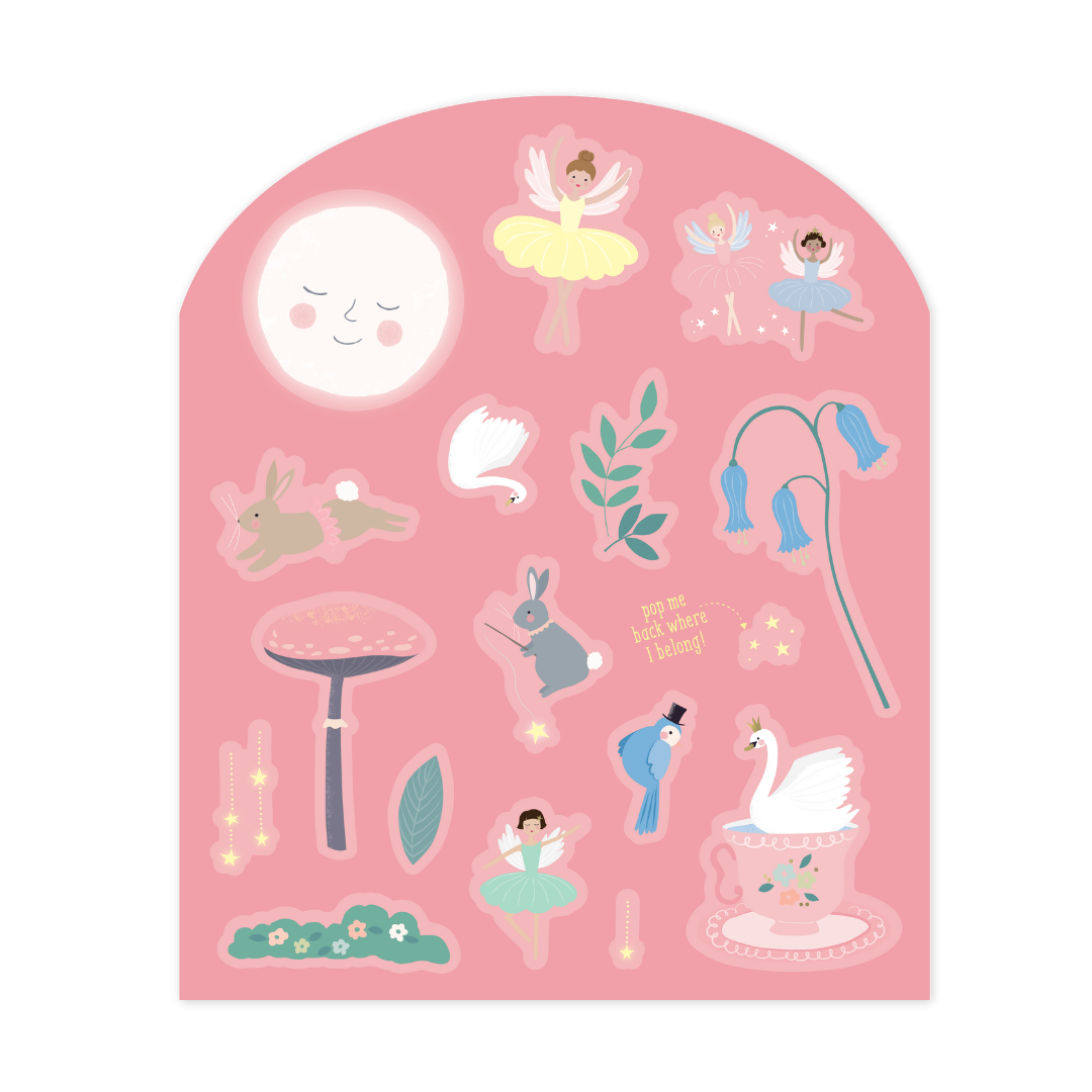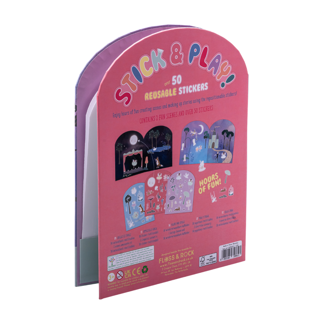 Enchanted Stick & Play book is so much fun, and educational at the same time. With over 50 fun shaped reusable stickers including Ballerina's, a smiley moon, birds, rabbits and so much more. There are 2 fold out scenes to create and make up stories using the repositionable stickers. At the back there is a seperate section where you match the stickers to their shapes. This will entertain little ones for hours! The hard back book folds completely flat making it perfect for travel and taking out and about.