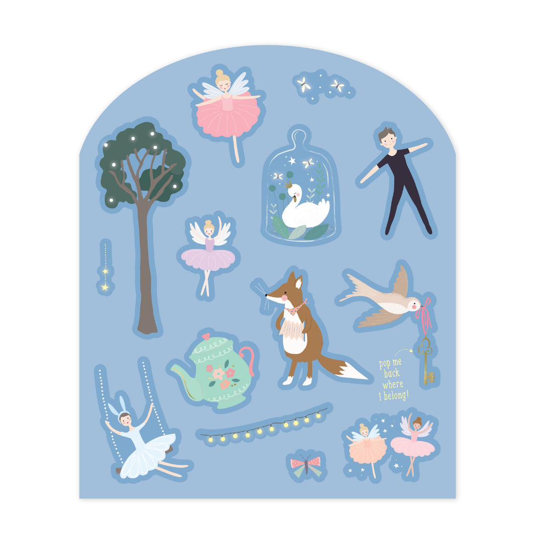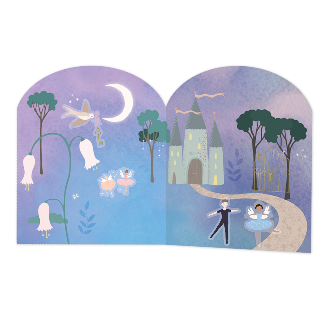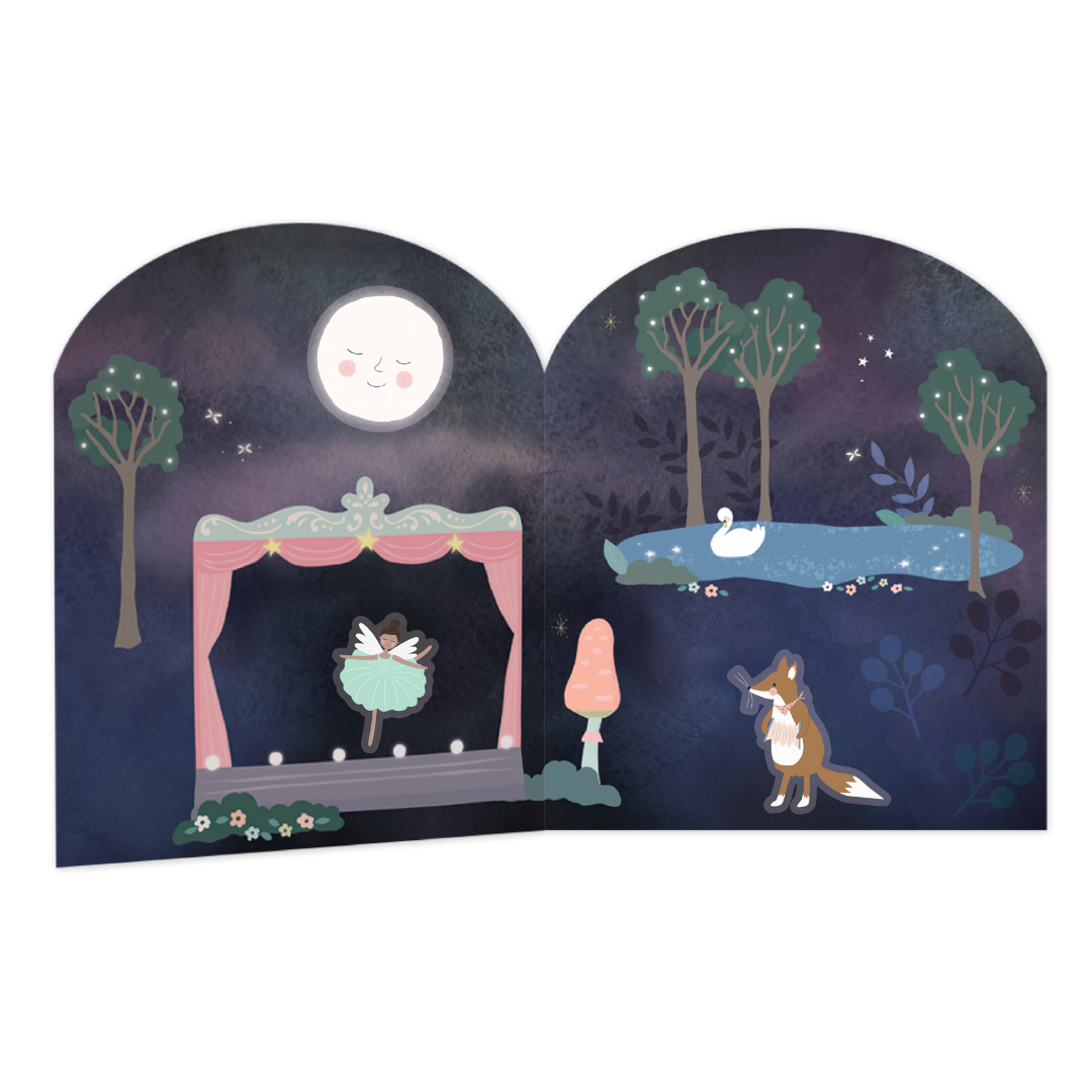 Enchanted Stick & Play book is so much fun, and educational at the same time. With over 50 fun shaped reusable stickers including Ballerina's, a smiley moon, birds, rabbits and so much more. There are 2 fold out scenes to create and make up stories using the repositionable stickers. At the back there is a seperate section where you match the stickers to their shapes. This will entertain little ones for hours! The hard back book folds completely flat making it perfect for travel and taking out and about.