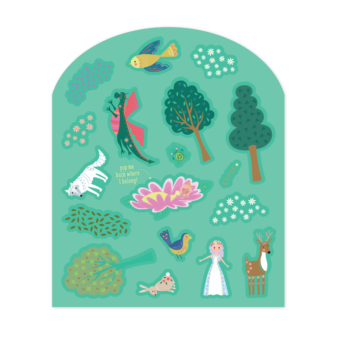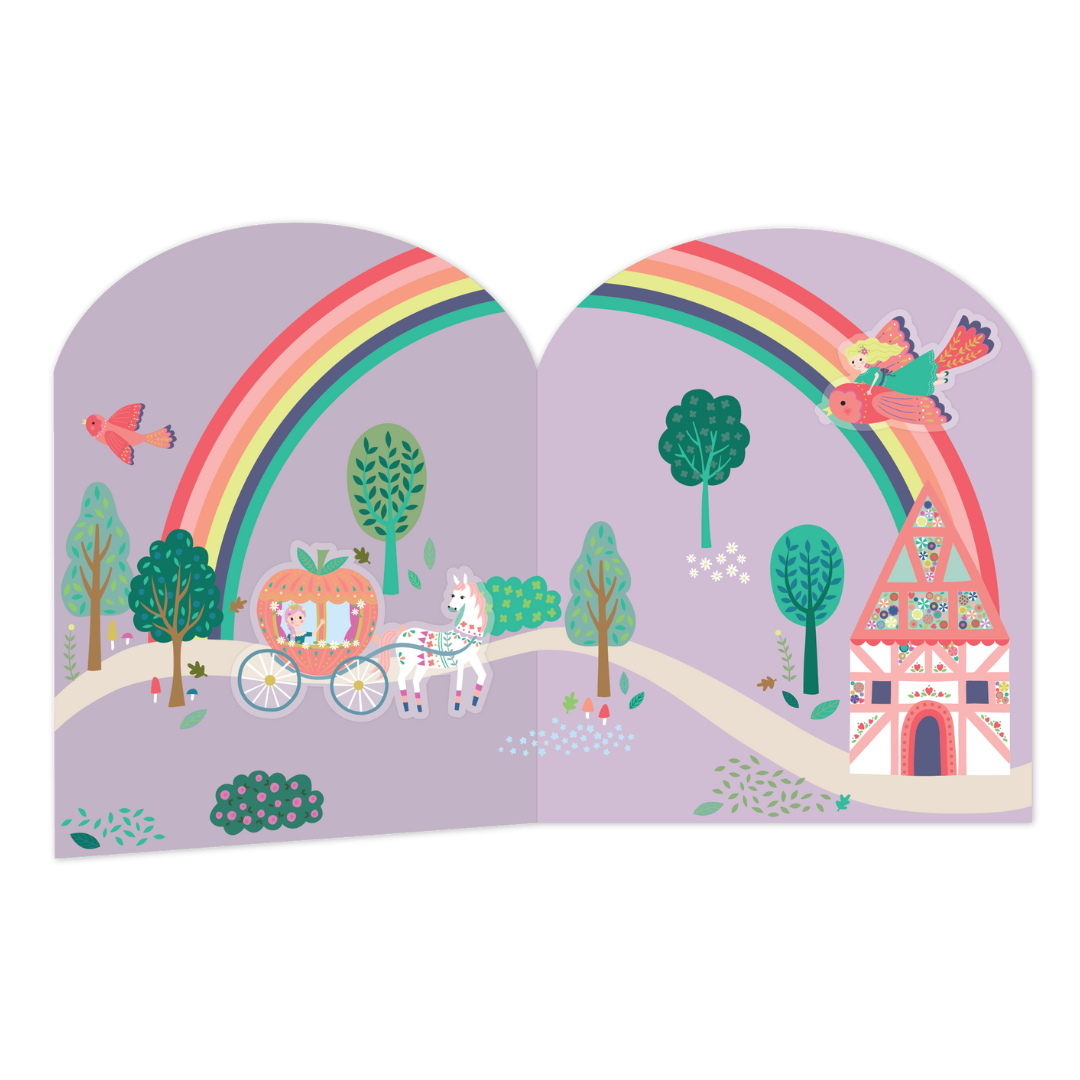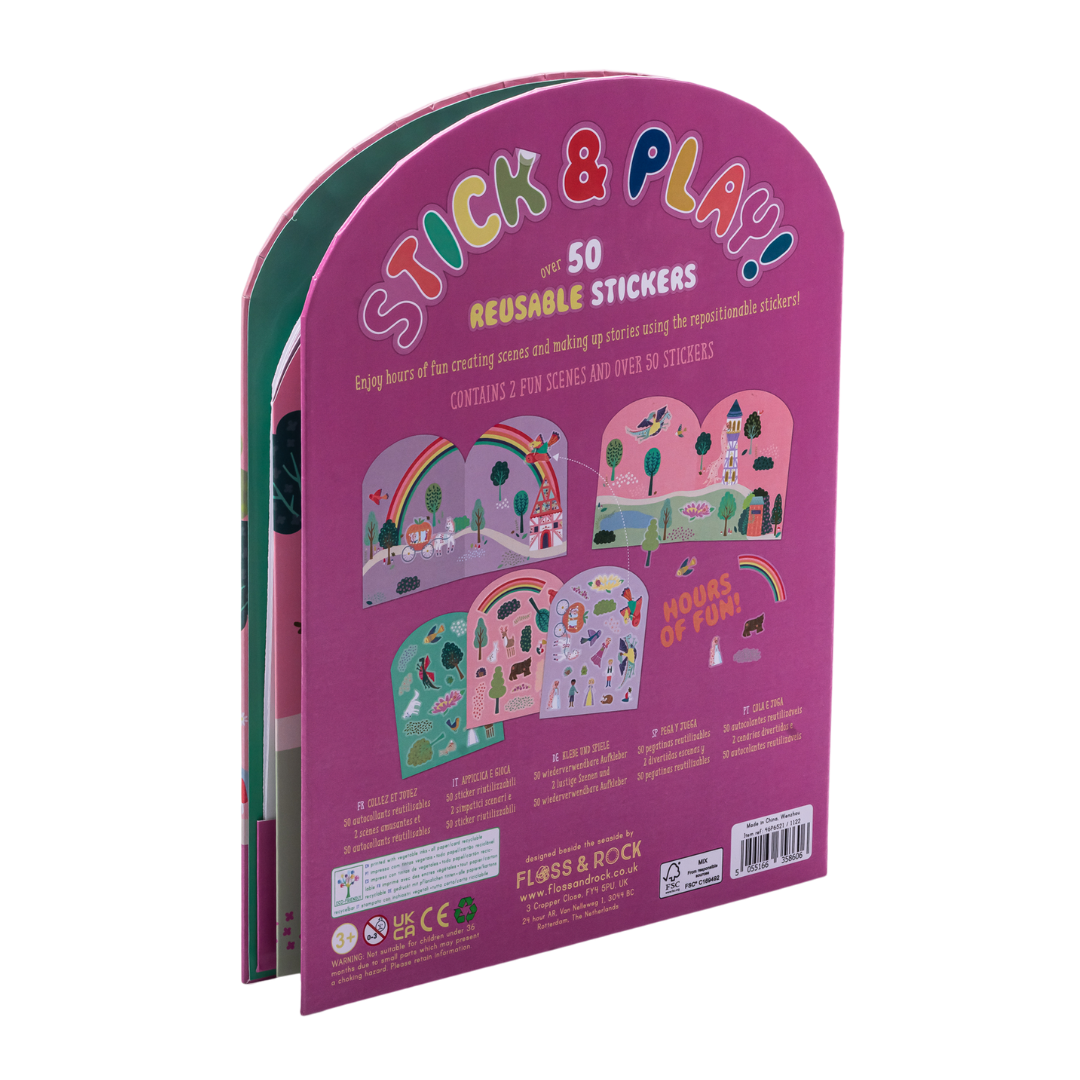Fairy Tale Stick & Play book is so much fun, and educational at the same time. With over 50 fun shaped reusable stickers including Princesses, flying dragons, birds, deer, horse and carriage and so much more. There are 2 fold out scenes to create and make up stories using the repositionable stickers. At the back there is a seperate section where you match the stickers to their shapes. This will entertain little ones for hours! The hard back book folds completely flat making it perfect for travel and taking out and about.
