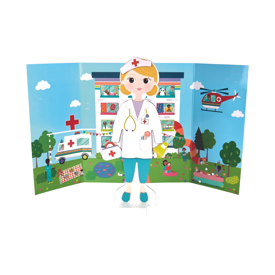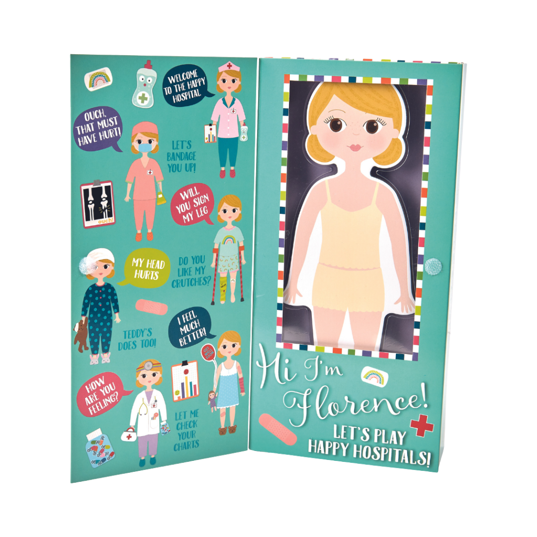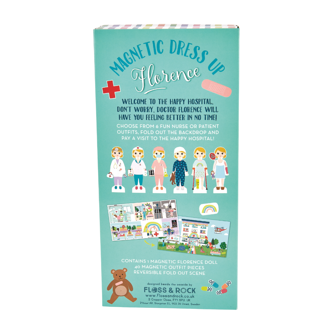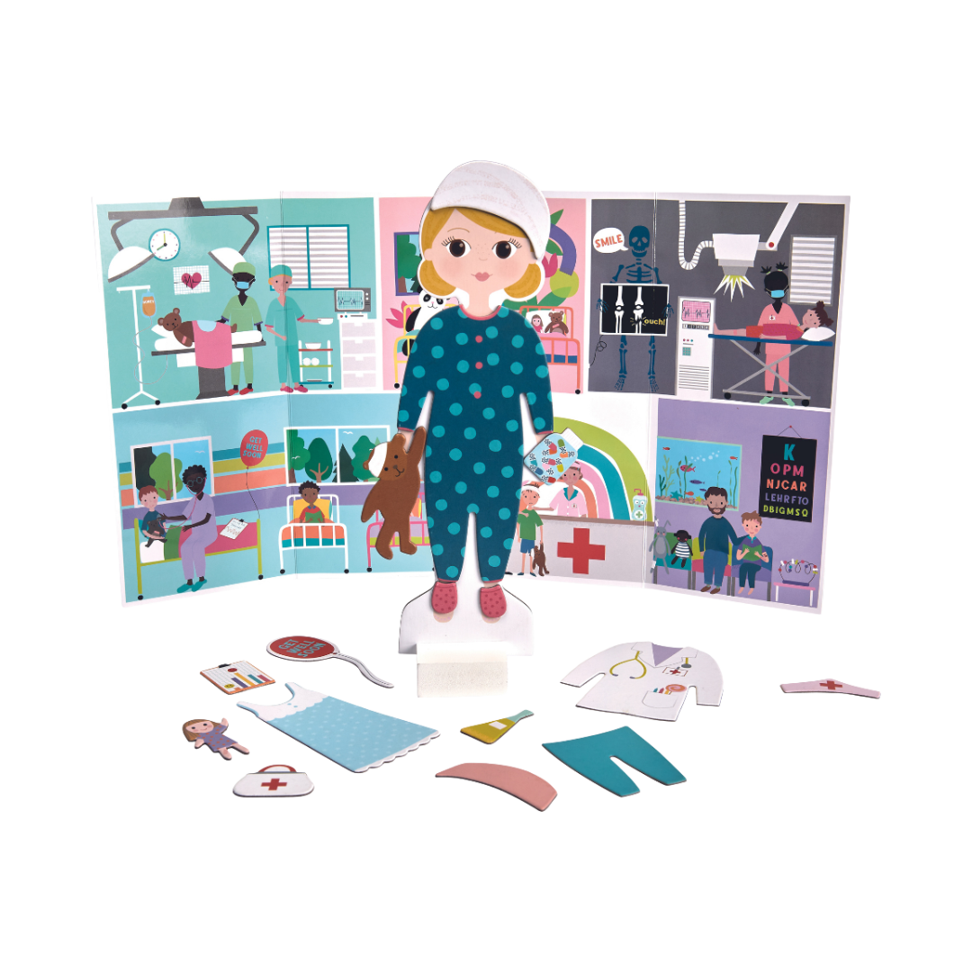 Florence loves to play hospitals! Do you? Dress her up as a doctor, nurse, patient and more. Featuring one doll and stand, a reversible backdrop scene and 40 magnetic pieces all contained in a gorgeous reusable gift box. This is the perfect gift for a budding doctor, nurse or someone who just loves to play hospitals just like Florence!
