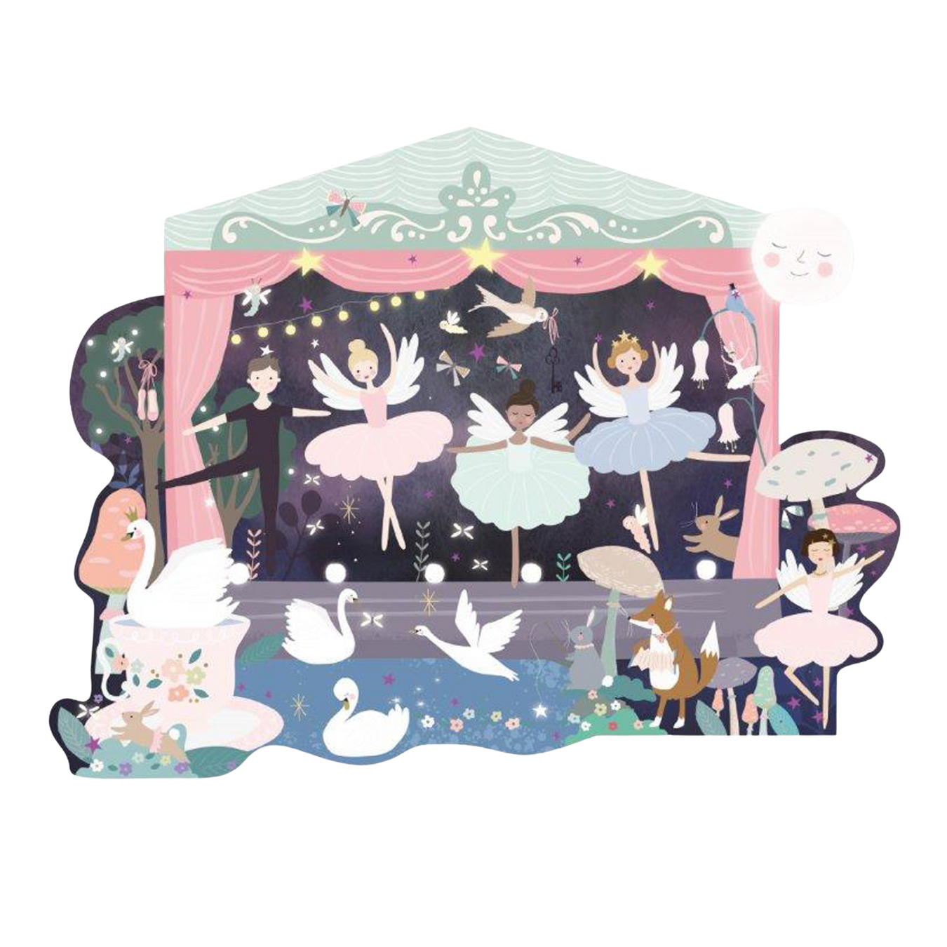 Our gorgeous Ballet Dancers feature on the front of the shaped box alongside their Enchanted Forest Friends. Inside there are 80 puzzle pieces which make up a beautiful scene set in a Magical Theatre. Both the puzzle and the box feature shiny foiled detail.