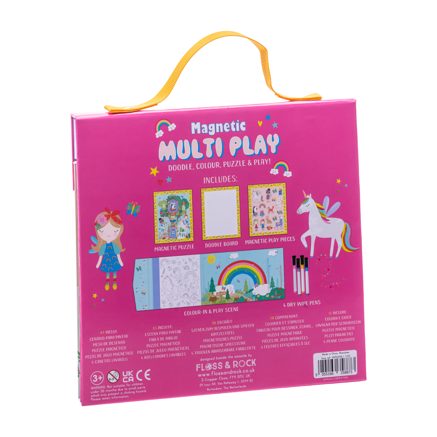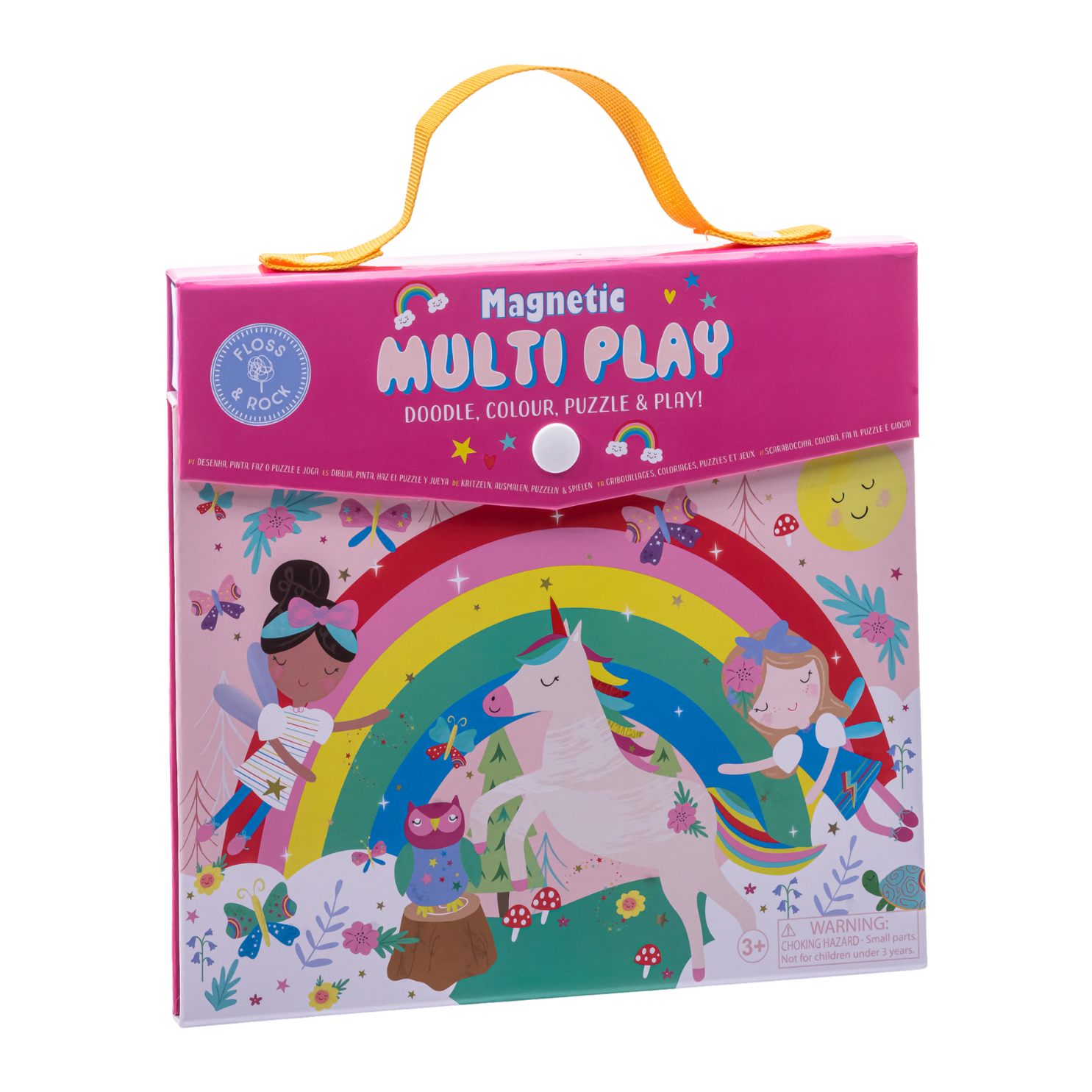 Doodle, colour, puzzle & play! The Rainbow Fairy Magnetic Multi Play is the ultimate multidimensional game. With 4 different activities to keep little ones entertained for hours. Open up the popper to reveal a 20 piece magnetic puzzle, 4 colour dry wipe pens with erasers, pop out and play magnetic pieces, a doodle and a colour in section. No danger of losing any pieces with them all being magnetic making it perfect for travel and taking out and about. Have so much fun with Unicorns, Fairies, Roller Blading Llamas and so much more. Reusable over and over again.