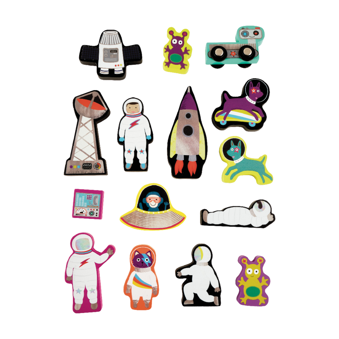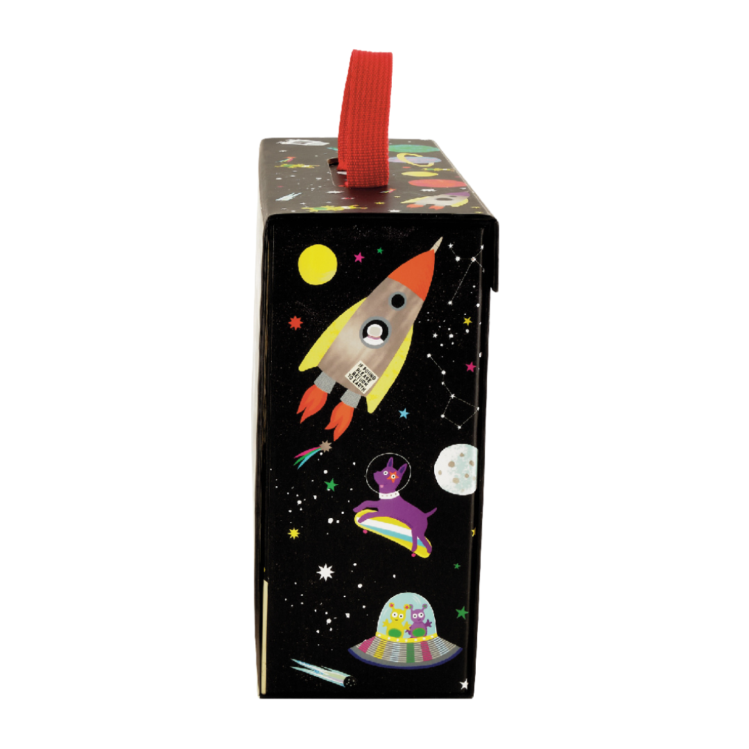 Which little person would not want a SPACE themed portable playbox? Our Space playbox comes complete with a cotton bag holding 15 fantastic, wooden, double sided pieces and characters. There are astronauts, rockets, aliens, flying saucers and more. Not to mention 2 brilliant pieces on wheels which can be joined together with magnets. With a fold down lid you can land on the moon or play inside the box which reveals the space station. There are little hide and seek windows for extra fun. It is fully portable with a cool carry handle should you want to take this to friends and it all stores away super quick! Enjoy hours of fun playing alone or with friends and siblings.