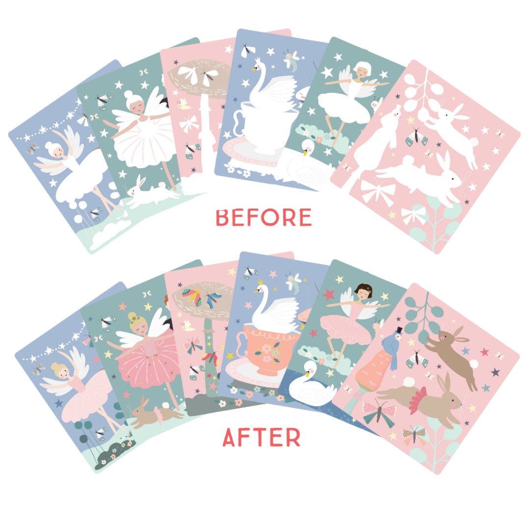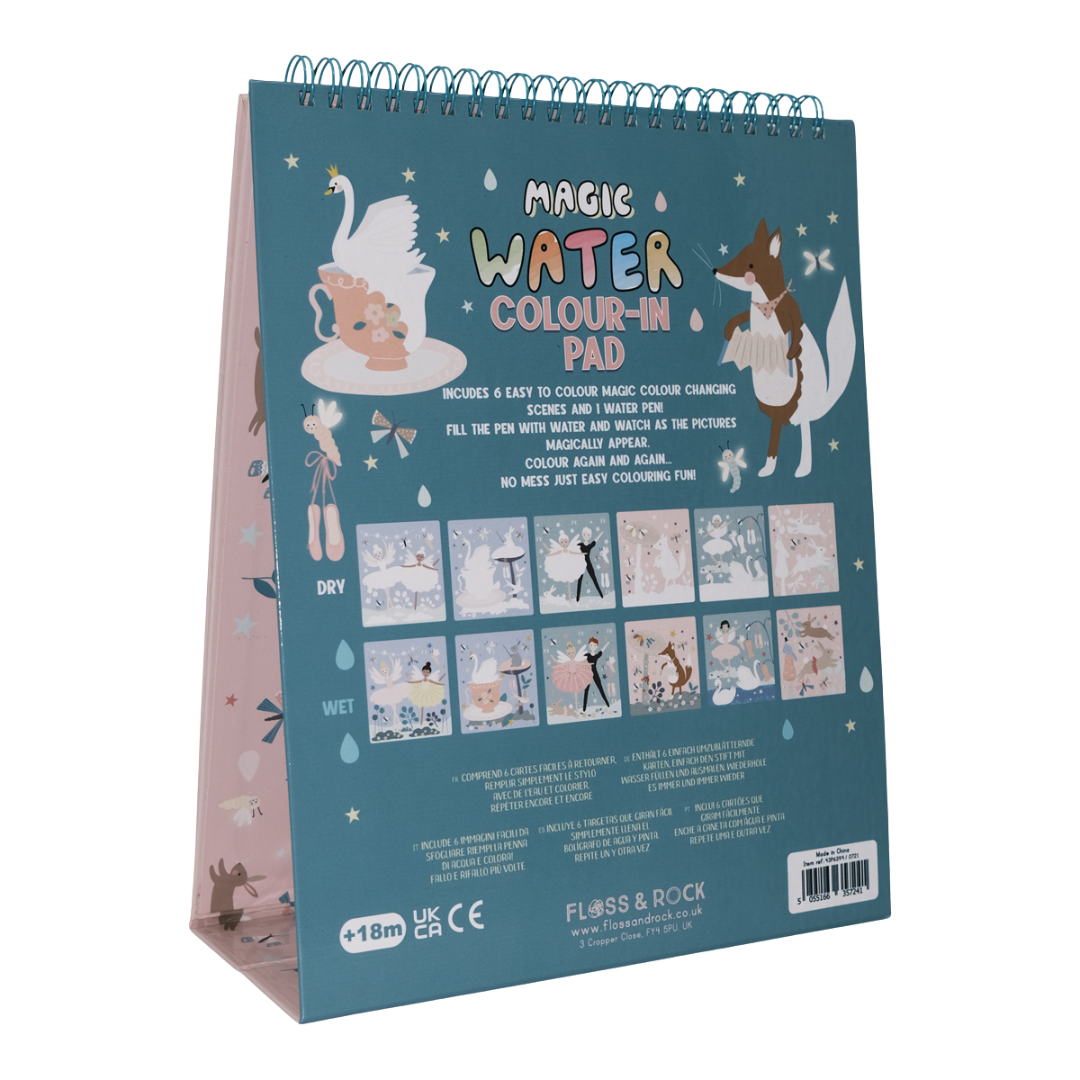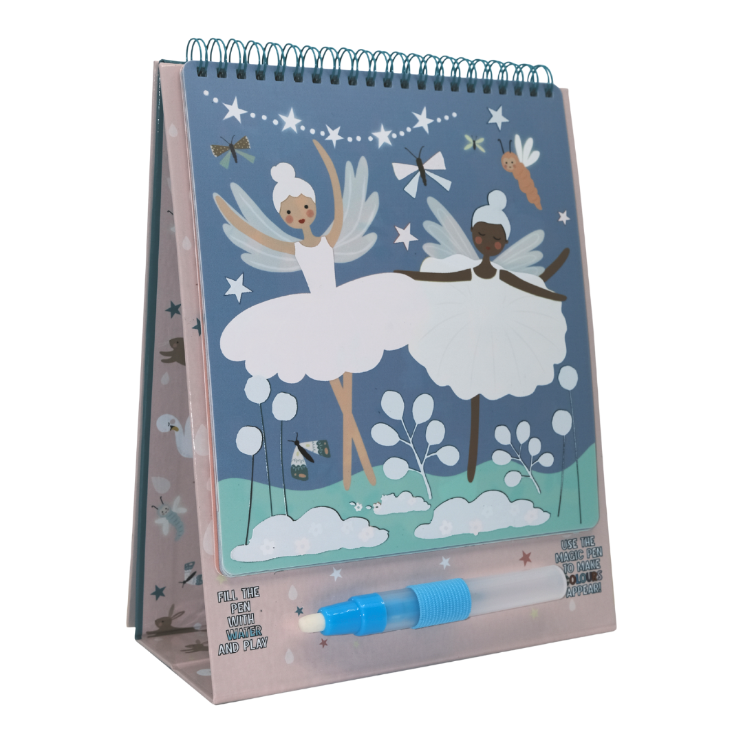 Our Magic Water Easel Pads are so much fun! Like our popular water cards, fill up the pen with water and colour in the designs to see them magically appear, then disappear once dry. The 6 brightly coloured fun sheets are held together in a spiral bound pad allowing you to flip them over once complete. The built-in easel stands the pad up so you can use it like a ‘proper’ artist! The pad is reusable over and over again and you’ll have so much fun revealing the colourful ballerinas, swans and friendly forest animals! Once you’ve finished your creative session, close the pad and secure your special water pen in the elastic closure to keep it nice and safe. This portable pad is perfect for taking out and about (and you don’t have to worry about any mess either!)