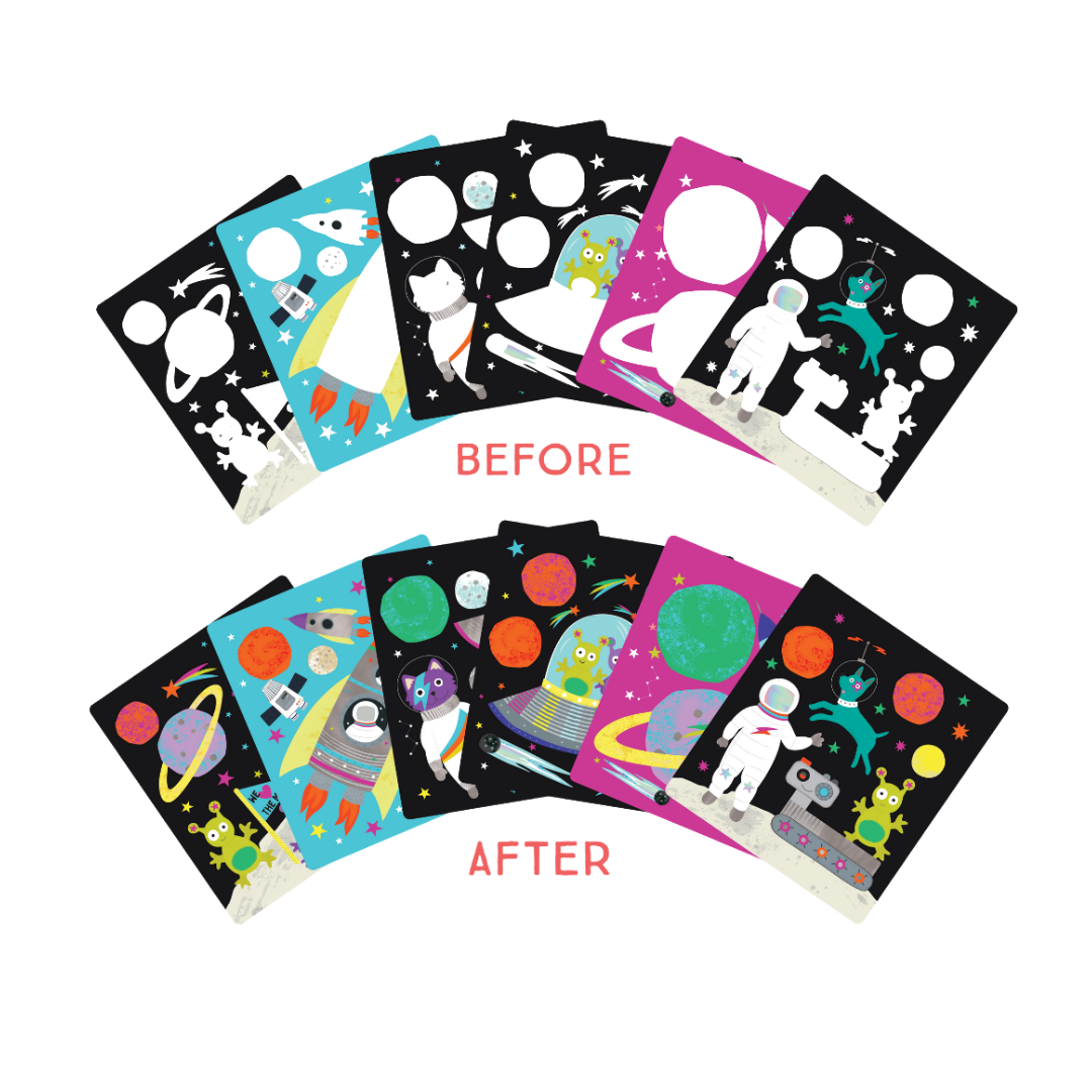 Our Magic Water Easel Pads are so much fun! Like our popular water cards, fill up the pen with water and colour in the designs to see them magically appear, then disappear once dry. The 6 brightly coloured fun sheets are held together in a spiral bound pad allowing you to flip them over once complete. The built-in easel stands the pad up so you can use it like a ‘proper’ artist! The pad is reusable over and over again and you’ll have so much fun revealing the colourful space people, aliens, planets, shooting stars and much more! Once you’ve finished your creative session, close the pad and secure your special water pen in the elastic closure to keep it nice and safe. This portable pad is perfect for taking out and about (and you don’t have to worry about any mess either!)